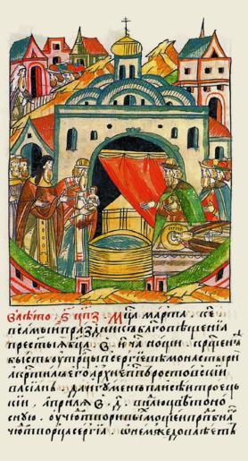 | Keywords: Facial Chronicle - b.16, p. 360 - Baptism of Vasily III.gif в 6987 году месяца ма та в 25 день в са- мый п аздник Благо- вещения П есвятой Бого одицы в вось- мом часу ночи К е- щен же был у Т оицы в Се гиеве монасты е а к естил его а хи- епископ Ростовский Вассиан да игумен Т оицкий Паисий ап еля в 4 день в не- делю Цветоносную у чудотво ных мощей п еподобного чудот- во ца Се гия о чем следует http //www runivers ru/bookreader/book481263/ page/5/mode/1up 16th-century anonymous PD-Old Facial Chronicle v 8 - Shumilovskiy tom 1425; 1478-1533 Files uploaded by Shakko from various sources 1479 in Russia Vasily III of Russia in miniature |