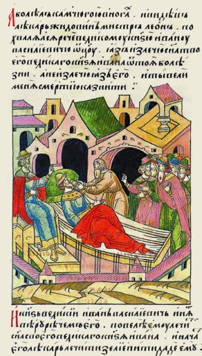 | Keywords: Facial Chronicle - b.17, p. 113 - illness of Ivan the Young.gif А болел он нога- ми камчугой и посмот ев его лека ь жидовин мист Леон по- хваляясь сказал его отцу великому князю Ивану Васильевичу «Я излечу твоего сына великого князя от той болезни а если не из- лечу я его то ты вели меня п едать сме т- ной казни» И великий князь Иван Василье- вич пове ил его ечам повелел ему лечить своего сына великого князя Ивана И начал его лечить лека ь дал ему пить зелье http //www runivers ru/bookreader/book481263/ page/5/mode/1up 16th-century anonymous PD-Old Facial Chronicle v 8 - Shumilovskiy tom 1425; 1478-1533 Files uploaded by Shakko from various sources Ivan Ivanovich Molodoy in miniature 1490 in Russia |