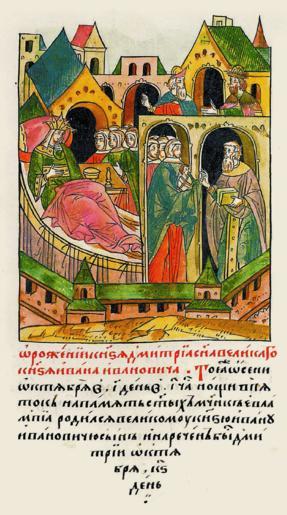 | Keywords: Facial Chronicle - b.17, p. 020 - Birth of Dmitriy Vnuk.gif О ождении князя Дмит ия сына вели- кого князя Ивана Ива- новича В ту же осень октяб я в 10 день в 10-м часу ночи в пятницу на память святого мученика Евлампия одился сын у великого князя Ива- на Ивановича и был на ечен Дмит ием октяб я в 26 день http //www runivers ru/bookreader/book481263/ page/5/mode/1up 16th-century anonymous PD-Old Facial Chronicle v 8 - Shumilovskiy tom 1425; 1478-1533 Files uploaded by Shakko from various sources 1483 in Russia Dmitriy Ivanovich the Grandson in miniature Elena Voloshanka of Moldavia |