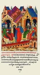 | Keywords: Facial Chronicle - b.17, p. 493.gif Об опале на внука ве- ликого князя Дмит ия В ту же весну в ап е- ле в 11 день в поне- дельник великий князь Иван Васильевич по- ложил опалу на своего внука великого князя Дмит ия и на его мать великую княгиню Елену http //sterligoff ru/books/Rus_Kniga 2018 pdf 16th-century anonymous PD-Old Facial Chronicle v 8 - Shumilovskiy tom 1425; 1478-1533 Files uploaded by Shakko from various sources Elena Voloshanka of Moldavia Ivan III of Russia in miniature Dmitriy Ivanovich the Grandson in miniature |