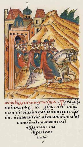 | Keywords: Facial Chronicle - b.18, p. 030.jpg О поезде великого князя В том же меся- це сентяб е в 21 день в четве г великий князь всея Руси Иван Васильевич со своим сыном великим кня- зем Василием Ива- новичем и с детьми выехал из осквы http //sterligoff ru/books/Rus_Kniga 2018 pdf 16th-century anonymous PD-Old Facial Chronicle v 8 - Shumilovskiy tom 1425; 1478-1533 Files uploaded by Shakko from various sources Ivan III of Russia in miniature Vasily III of Russia in miniature Dmitriy Ivanovich Zhilka of Uglich 1504 in Russia |