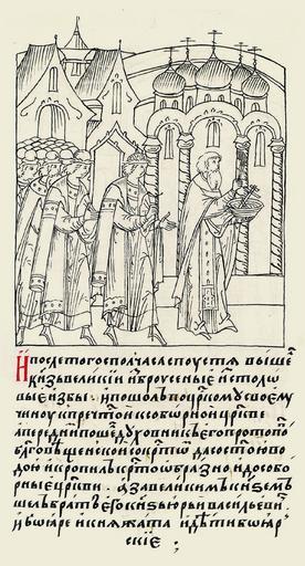 | Keywords: Facial Chronicle - b.20, p. 275 - Coronation Ivan IV (3).jpg Coronationscene Ivan IV / Krönungsszene von Iwan IV И после того спустя полчаса вышел великий князь из Столовой б усяной избы и по- шел по ца скому своему чину к Успен- ской собо ной це кви; а пе ед ними шел его духовник Благовещен- ский п отопоп с к е- стом и святой водой и к опил к естоо- б азно до собо ной це кви; а за великим князем шел его б ат князь Ю ий Василье- вич и боя е и княжа- та и боя ские дети Book of the Tsar / Buch der Zaren century 16 author PD-Art PD-Art Facial Chronicle v 10 - Tsarstvennaya kniga 1533-1553 Ivan IV's coronation Yuri of Uglich 1532-1563 in miniature |