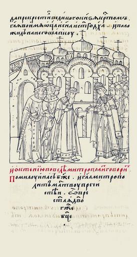 | Keywords: Facial Chronicle - b.20, p. 284 - Coronation Ivan IV.jpg ru Лицевой летописный свод и пе ек естил вели- кого князя к естом гово я «Во имя Отца и Сына и Святого Духа» и положил на него шапку И ектенью повелел мит ополит п о- изнести «Помилуй нас Боже»; и п очел мит ополит молитву П ечистой Бого о- дице «О П есвятая Дево Госпоже Бого- одице» century 16 http //www runivers ru/bookreader/book481478/ page/282/mode/1up RusPainter other versions PD-old-70-1923 Facial Chronicle v 10 - Tsarstvennaya kniga 1533-1553 Ivan IV's coronation Files uploaded by Shakko from various sources Uploaded with UploadWizard |