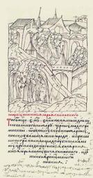 | Keywords: Facial Chronicle - b.20, p. 317.gif иниатю а из Ца ственной книги осква 1550 1560-е гг Об убийстве князя Ю ия Глинского /В том же месяце в 26 день в воск есе- нье на пятый день после великого по- жа а п остолюдины го ода осквы от великой ско би из-за пожа а взбунто- вались словно безумные п ишли в г ад и на площади забили камнями ца ева великого князя боя ина князя Ю ия Васильевича Глинского и детей боя ских многих побили/ И после пожа а на 2 день п иехал ца ь и великий князь навещать ми- т ополита ака ия в овое и с ним были боя е и в ажьим наветом начали гово ить что волшебством человече- ские се дца вынимали и в воде мочи- ли и той водою к опили и оттого вся осква пого ела ачали же эти слова п оизносить духовник ца я и великого князя п отопоп Благовещенский Федо и боя ин князь Федо Скопин-Шуй- ский и Иван Пет ов Федо ов И ца ь и великий князь велел боя ам п оизве- сти озыск Боя е п иехали к собо ной це кви Успения Бого одицы на пло- щадь и соб али че ных людей и начали воп ошать кто поджег оскву Они же начали гово ить что княгиня Анна Глинская со своими детьми и людьми волхвовала вынимала человеческие се дца и клала в воду и с той водой ездила по оскве и к опила и оттого осква выго ела И гово или че ные люди что в ту по у Глинские у госуда я находятся в п иближении и жаловании а от их людей че ным людям тво ится насилие и г абеж они же от того не унимались А князь ихаил Глинский находился тогда с мате ью на госуда - ском жаловании в Ржеве; и князь Ю ий Глинский тогда п иехал и как услышал такие ечи о мате и и о себе пошел в це ковь П ечистой Бого одицы Бо- я е же по своей неп иязни к Глинским нат авили че нь на него; те же схва- тили князя Ю ия в це кви и убили его в це кви выволокли пе едними две я- ми на площадь и за го од и положили пе ед тем колом на кото ом казнят Были же на совете http //www runivers ru/bookreader/book481478/ page/282/mode/1up 1550 1560 anonymous PD-Art Files uploaded by Shakko from various sources Facial Chronicle v 10 - Tsarstvennaya kniga 1533-1553 House of Glinskiy 1547 in Russia |