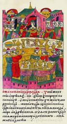 | Keywords: Facial Chronicle - b.22, p. 165 - Vladimir Staritsky's wedding.gif О жаловании ца я и госуда я Той же весной в ап еле в 28 день в неделю вто ую после Пасхи святых Жен и оносиц женил ца ь и великий князь госуда ь Иван Васильевич князя Владими а Анд еевича взял за него дочь князя Романа Одоевского княжну Евдокию http //www runivers ru/bookreader/book482205/ page/17/mode/1up century 16 anonimus Facial Chronicle v 9 - Sinodalniy tom 1533-1542; 1553-1567 Files uploaded by Shakko from various sources 1555 in Russia PD-Art Vladimir Andreevich of Staritsa in miniature Weddings in medieval manuscripts Russia House of Odoevski |