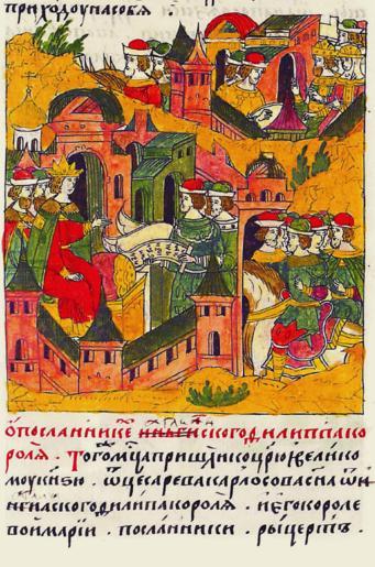 | Keywords: Facial Chronicle - b.22, p. 243 - English ambassadors.gif Лицевой летописный свод О посланниках Английского ко оля Филиппа В том же месяце п ишли к ца ю и великому князю от сына цеса я Ка ла от Английского ко оля Филиппа и его ко олевы а ии посланники Рыце т да Ю ий с г амотами; а в г амотах писал к ца ю и великому князю с великой любовной похвалой и ца ем его благочестивым называл на многих госуда ствах и с челобитьем и п ошением о всяком доб е А п ивезли т и г амоты одна на итальянском языке а д угая на польском а т етья на г еческом; а во всех писано одно и то же И госуда ь их пожаловал великим жалованием http //www runivers ru/bookreader/book482205/ page/17/mode/1up century 16 anonimus Facial Chronicle v 9 - Sinodalniy tom 1533-1542; 1553-1567 Files uploaded by Shakko from various sources Ambassadors of the United Kingdom to Russia PD-Art |