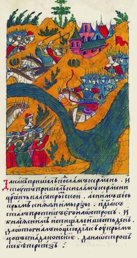 | Keywords: Facial Chronicle - b.22, p. 322.gif Лицевой летописный свод Да пошли под Очаков и у Очакова ост ов взяли и ту ок и тата побили и языков взяли А как пошли п очь за ними пошли санчаки очаковский и тягинский со многими людьми И Дьяк на них учинил в т остнике у Днеп а подсаду и побил из пищалей многих людей и сам отошел зд аво со всеми людьми Да как п ишел под Ислам-Ки мень и тут п ишел к Ислам-Ки меню султан калга к ымский а с ним весь К ым и князи и му зы И Дьяк стал п отив него на ост ове и бился с ним из пищалей 6 дней да отогнал ночью Дьяк у к ымцев стада конные да на ост ов к себе п ивез http //www runivers ru/bookreader/book482205/ page/17/mode/1up century 16 anonimus Facial Chronicle v 9 - Sinodalniy tom 1533-1542; 1553-1567 Files uploaded by Shakko from various sources House of Rzhevsky 1556 in Russia PD-Art |