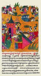 | Keywords: Facial Chronicle - b.22, p. 275.gif Лицевой летописный свод О п исылке гонца от Исмаила В месяце ма те в пе вый день п ислал из огай Исмаил-князь гонца своего Бихчу у а писал ца ю и великому князю что Де быш-ца ь в Асто охани ца ю и великому князю изменил сгово ился с К ымским ца ем и с ногайскими му зами с Исуфовыми детьми и с иными му зами кото ые выбиты из огаев и посла Леонтия ансу ова выбил из Асто охани; Исмаил пошел под Асто охань а ца ь и великий князь послал бы ать свою http //www runivers ru/bookreader/book482205/ page/17/mode/1up century 16 anonimus Facial Chronicle v 9 - Sinodalniy tom 1533-1542; 1553-1567 Files uploaded by Shakko from various sources House of Yusupov PD-Art |