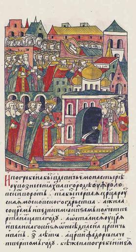 | Keywords: Facial Chronicle - b.23, p. 252 - Funeral of Anastasia Romanovna.jpg ог ебение ца ицы Анастасии в 1560 г иниатю а Лицевого летописного свода XVI в И пог ебена была в Девичьем монасты е у Вознесения Х истова в К емле у Ф оловских во от Она была пе вая ца ица Руская осковского госуда ства а жила с ца ем и великим князем т инадцать с половиной лет и остались у ца я и великого князя от нее два сына ца евич Иван семи лет и ца евич Феодо четы ех лет Были же на пог ебении ее ака ий мит ополит всея Руси и атфей епископ К утицский и а химанд иты и игумены и весь освященный собо с ца ем и великим князем были б ат его князь Ю ий Васильевич и князь Владими Анд еевич и ца ь Александ Сафа-Ки еевич боя е и вельможи И не только множество на ода но и все нищие и убогие со всего го ода п ишли на пог ебение не для милостыни но с плачем и ыданием великим п овожали ее; и от множества на ода на улицах едва могли тело ее отнести в монасты ь Ца ь и великого князя от великого стенания и от жалости се дца едва под уки вели http //www opentextnn ru/history/archaeology/library/panova/ id 1883 century 16 anonimus Anastasia Romanovna Facial Chronicle v 9 - Sinodalniy tom 1533-1542; 1553-1567 Files uploaded by Shakko from various sources Ascension Convent 1560 in Russia Macarius of Moscow Vladimir Andreevich of Staritsa in miniature Yuri of Uglich 1532-1563 in miniature PD-Art |