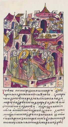 | Keywords: Facial Chronicle - b.23, p. 227 - Birth of Eudokia of Staritsa.jpg Лицевой летописный свод Той же ночью со с еды на четве г в то же в емя на десятом часу ночи за т и часа до ассвета одилась у князя Владими а Анд еевича дочь Евдокия от его княгини Евдокии И ца ь и великий князь а с ним сын его ца евич Иван да с ними ца ь Казанский Александ и многие боя е на следующий день в пятницу были у князя Владими а Анд еевича на его адости и по адовались с ним и овощи вкушали http //www runivers ru/bookreader/book482205/ page/17/mode/1up century 16 anonimus Facial Chronicle v 9 - Sinodalniy tom 1533-1542; 1553-1567 Files uploaded by Shakko from various sources 1561 in Russia PD-Art Vladimir Andreevich of Staritsa in miniature Eudokia Vladimirovna of Staritsa |