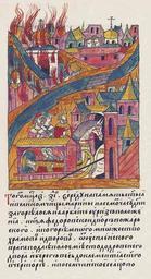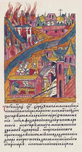 | Keywords: Facial Chronicle - b.23, p. 244.jpg Лицевой летописный свод В том же месяце в 17 день в с еду на память святой великомученицы а ины в седьмом часу дня заго елся на А бате у це кви Риз Положения дво князя Федо а Пожа ского И пого ело многое множество х амов и дво ов от Успенского ов ага подле отк ытого места до д овяного дво а и бе ег весь до це кви святого Клементия в Че то ье и по Семчинское сельцо и до це кви П ечистой на огилицах и А бат весь и за А бат по овинский монасты ь А ца ица и великая княгиня Анастасия в то в емя была больна и ца ь и великий князь великую княгиню п оводил в свое село в Коломенское с большим т удом потому что болезнь ее была очень тяжела http //www runivers ru/bookreader/book482205/ page/17/mode/1up century 16 anonimus Facial Chronicle v 9 - Sinodalniy tom 1533-1542; 1553-1567 Files uploaded by Shakko from various sources PD-Art Fires in Moscow Anastasia Romanovna |
