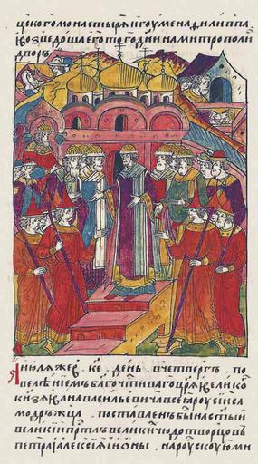 | Keywords: Facial Chronicle - b.23, p. 463.jpg Лицевой летописный свод И в июле же в 25 день в четве г повелением благоче- стивого ца я и вели- кого князя всея Руси Ивана Васильевича самоде жца поставлен был на святой вели- кий п естол великих чудотво цев Пет а Алексия и Ионы на Русскую мит ополию игумен Соловецкий Филипп Колычев усскими а хиеписко- пами и епископами Пимином а хие- пископом Великого овго ода и Пскова Ге маном а хиепи- скопом Казанским и Свияжским и- канд ом а хиепи- скопом Ростовским и Я ославским Еле- уфе ием епископом Суздальским и Та- усским Филофеем епископом Рязан- ским и у омским Семионом епископом Смоленским и Б ян- ским Ва лаамом епископом Коломен- ским и Каши ским Галактионом еписко- пом Са ским и По- донским Иоасафом епископом Пе мским и Вологодским и всем освященным собо ом А Полоцкий а хие- пископ в то в емя скончался а Тве ской епископ Акакий был тогда в болезни да к тому же ста был и остался в Тве и и с а хиепископами и епископами с из- б анием мит ополита был единомыслен а поставлении же был ца ь и великий князь всея Руси Иван Васильевич и дети его ца евич Иван и ца- евич Федо и князь Владими Анд еевич http //sterligoff ru/books/Rus_Kniga 2023 pdf century 16 anonimus Facial Chronicle v 9 - Sinodalniy tom 1533-1542; 1553-1567 Files uploaded by Shakko from various sources PD-Art Philip II Metropolitan of Moscow 1566 in Russia |