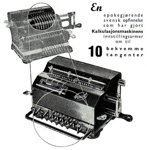 Keywords: Facit keys 1935.jpg en Advertisement showing the revolutionary new Facit mechanical calculator with ten keys for entering digits Text in Norwegian sv Annonsbild som visar den revolutionerande nya Facit räknemaskinen mekanisk adderare med tio tangenter för att mata in siffror Text på norska Advertisement in http //runeberg org/merkbio/0228 html Merkantilt biografisk leksikon 1935 page 152 for A/S Dalton Machine Co Oslo Norwegian reseller of Facit calculators Author 1935 PD-old Facit Advertisements for mechanical calculators Location not applicable |
