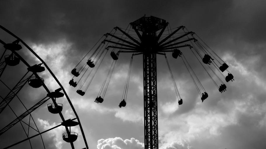 Keywords: fair carousel speed turn fun year market folk festival kettenkarusell ride rides ferris wheel sky clouds mood dark lighting black and white monochrome