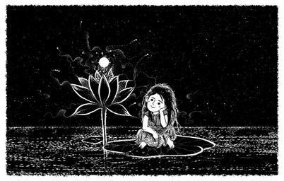 Keywords: fairy tale night flower girl star sleep dream cartoon black and white