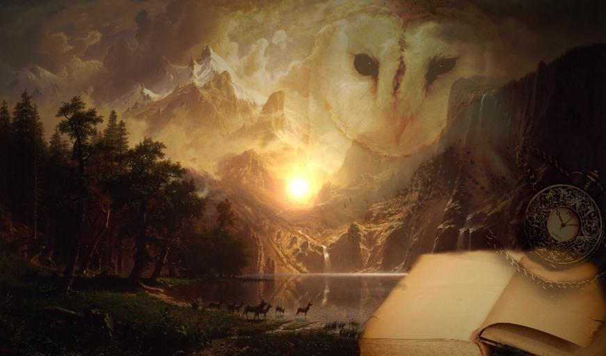 Keywords: fairy tales book mythical creatures middle ages mystical atmosphere mountain sky dream world view dreams storybook horse forest romantic books owl pocket watch nature discoloration sunlight clouds sun lichtblick mood fairytale shadow play leaves trees landscape