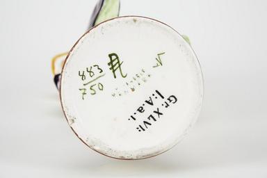 | Keywords: Fajans, tallrik, baksida, 1905-1906 - Hallwylska museet - 90471.tif TALLRIK Rund med kälformig kep och snett utstående brett brätte samt på fotkant Dekor I färger under blyglasyr denna finsprucken Godset vitt På bottnens insida konung Haakon VII s och drottning Mauds av Norge krönta initialer i mörkblått kronans foder i mörkrött nedtill årtalet i samma färg som initialerna; nedanför årtalet samt kring initialerna rankor i mörkare och ljusare grönt med blad liknande lingonrisets nerverna röda; runt bottenkanten en mörkblå rand På brättet dekor av tre löst tvinnade band i mörkblått upphängda vid ytterkanten i bruna öglor på varannan av bandet vindlingar två par bladliknande ornament i ljusblått Runt ytterkanten en rand i mörkblått därinnanför en något bredare dylik i ljusblått avbruten av nyssnämnda öglor På bottnens utsida en påklistrad lapp i grönt med upphöjt guldtryck med texten KRISTIANIA KUNSTHANDEL H 3 3 cm; D 24 8 cm Köbenhavns fajancefabrik f d Aluminia Från slutet av 1905 eller från 1906 Gåva till Wilhelmina von Hallwyl från hennes dotterson Rolf de Maré julaftonen 1914 Inköpt av honom hos konsthandlaren Ludv F Olsen Co Kristiania original caption Fajans tallrik baksida 1905-1906<br/> Nyckelord Signatur Fajans Prins Carneval Föremålsbild - 1905 1906 size cm 3 3 24 8 HWY place of origin Köpenhamn DK original filename hm_dig7213 13462 inventory number HWY XLVI I A b 01 90471 CC-BY-SA Erik Lernestål <gallery caption Different images of same object > File Fajans tallrik baksida 1905-1906 - Hallwylska museet - 90472 tif </gallery> Erik Lernestål Signatures Faience Faience in the Hallwyl museum Media contributed by LSH unmatched keyword Media contributed by LSH 2013-10 |