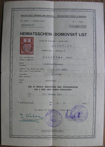 | Keywords: Falesny.Domovsky.List.Karel.Prokop.Alias.Karel.Kropacek.jpg cs Karel Prokop 1893 - 1943 - za první světové války příslušník československých legií v Rusku; za protektorátu přednosta a inspektor Finančního úřadu potravní daně a zároveň vedoucí odbojové skupiny v Praze Jinonicích jakož i zástupce velitele ilegální skupiny Vašek-Čeněk Po zátahu gestapa na jinonický akcíz 4 října 1941 přešel do ilegality a ukrýval se na plzeňsku kde používal falešné doklady na jméno Karel Kropáček Zatčen gestapem 4 července 1942 v Plzni - Skvrňanech Popraven dne 8 září 1943 ve věznici v Berlíně-Plötzensee Falešný domovský list z roku 1941 en Karel Prokop 1893 - 1943 During the First World War he was a member of the Czechoslovak legions in Russia During the protectorate he was a chief inspector of the Tax Office and excise taxes and he was also leader of resistance group in Prague Jinonice and also he was a deputy commander of an illegal group Vašek-Čeněk After the gestapo made an attack on the Jinonice excise duty office 4 October 1941 he went underground and he hid himself in around Pilsen where he used false documents in the name of Karel Kropáček Arrested by the Gestapo July 4 1942 in Pilsen - Skvrňany Executed to death on September 8 1943 in the prison in Berlin-Plötzensee Fake home certificate 1941 1941-10-31 CZ Volně přístupné archivy České republiky <br/> EN Freely accessible archives of the Czech Republic CZ Autorem tohoto dokumentu je neznámá osoba <br/> EN Author of this document is unknown person other versions Custom license marker 2016 04 23 anonymous-EU/cs PD-old PD-CzechGov Heroes Protectorate of Bohemia and Moravia Karel Prokop |