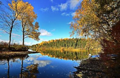 Keywords: fall lake landscape trees colors sky reflections contrast québec autumn landscape leaves afternoon calm isolated form serenity
