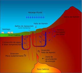 Keywords: Falla de ramon.jpg es diagrama de la Falla de Ramón con indicación de fuentes hidrotermales y zona de falla own R0MAN0 2009-11-12 trabajo propio Geological cross sections Geological diagrams in Spanish Geology of Chile Cerro de Ramón
