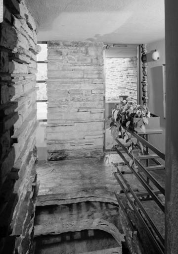 | Keywords: Fallingwater - Second floor stair landing - HABS PA,26-OHPY.V,1-60.jpg w Fallingwater State Route 381 Stewart Township Ohiopyle vicinity Fayette County PA - View from second floor hallway towards landing at top of stairway from living room Door at right leads to guest terrace Library of Congress Prints and Photographs Division Historic American Buildings Survey http //hdl loc gov/loc pnp/hhh pa1690 PA 26-OHPY V 1-60 February/March 1985 Jack E Boucher HABS staff photographer PA 26-OHPY V 1-60 hhh pa1690 Interior of Fallingwater |