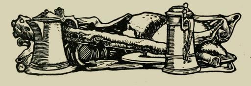 | Keywords: FamHis082.png en A tailpiece with 3 steins a club a roasted capon and a loaf of bread but her husband returning backe knockt at the doore The woman hearing this was amazed and knew not what to doe with her old lover but looking on her apron strings she striaght found as women use to doe a trick to put herself free from this feare; for shee put her lover under the bed the capon and bread she put under a tub the bottle of wine shee put behinde the chest and then she did open the doore and with a dissembling kisse welcomed her husband home asking him the reason why that he returned so quickly p 78 behold my spirit quoth Miles that brought me all that you have had; now bee as good as your word and swaddle him soundly I protest said the goodman your Devill is as like Goodman Stumpe the tooth-drawer as a pomewater is like an apple is it possible that your spirits can take other mens shapes Ile teach this to keepe his own shape; with that hee beat the old man soundly p 82 1916 https //archive org/details/famoushistoirieo00thom Early English Prose Romances III Fryer Bacon Edinburgh Otto Schulz Co https //archive org/stream/famoushistoirieo00thom page/82/mode/2up p 82 a reprinting of William Thoms's 1828 edition of an English prose romance available in manuscript by 1555 and first printed in 1627 Anonymous William Thoms editor other versions PD-1996 PD-1923 PD-EU-no author disclosure PD-retouched-user Harold Nelson The Famous Historie of Fryer Bacon Stein Cups in art Clubs in art Chickens in art Breads in art Wine in art Uploaded with UploadWizard Tailpieces book illustration Ornaments in Books |
