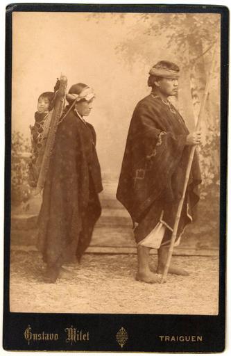Keywords: Familia mapuche - Traiguen 1890.jpg en Photograph black and white ; cabinet card; a studio portrait of a Mapuche man woman and baby seen standing in profile posed in front of a painted background of an outdoor scene; the man is holding a stick in one hand and wears a chamal or trarilanko headband and manta blanket/poncho ; the woman wears a trarilonko hair lace/headgear chaway earrings and manta and she carries the baby in a baby carrier made of wood and cord on her back; Traiguen Chile http //www britishmuseum org/research/search_the_collection_database/search_object_details aspx objectid 3085545 partid 1 searchText chile fromADBC ad toADBC ad numpages 10 images on orig 2fresearch 2fsearch_the_collection_database aspx currentPage 21 Milet RamÃrez Gustavo 1860 “1917 circa 1890 PD-old Mapuche people Ponchos 1890 in Chile |