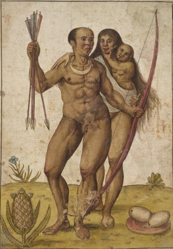 Keywords: Familia Tupinamba.jpg en Tupinamba Indian man woman and child; the man holds a bow and arrows and wears a neck-ornament the baby in a sling various fruit depicted in the foreground Pt Familia de idios Tupinamba o homem possui um arco e flechas e usa um ornamento no pescoço frutas diversas representadas em primeiro plano 2011-08-19 http //topbloger livejournal com/6450993 html John White PD-old-100 Uploaded with UploadWizard Tupí people Old images of Indigenous peoples of Brazil John White |