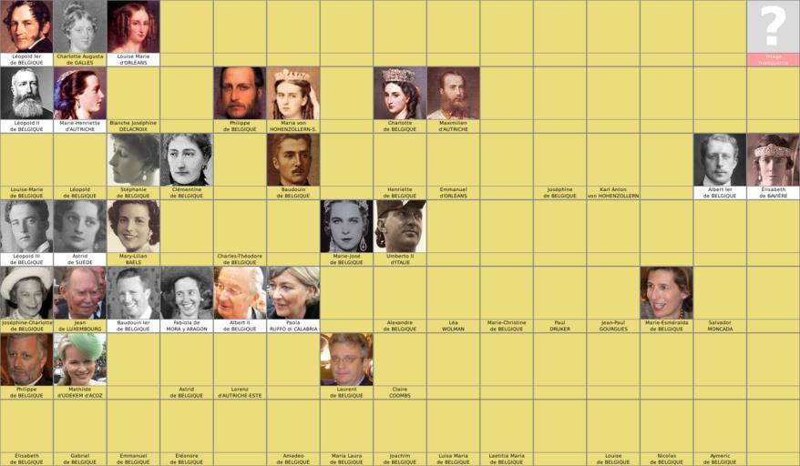 | Keywords: Famille royale belge-vignettes.png fr Mosaïque de vignettes de la famille royale belge à utiliser dans un arbre généalogique crop <br> en Mosaic of thumbnails of the Royal family of Belgium To be used with genealogy trees crop Leopold_I_by_Franz_Winterhalter jpg Princess_Charlotte_Augusta_of_Wales jpg Louise_Marie_d'Orléans-de_Keyser jpg To be extended 2010-10-25 09 56 UTC Leopold_I_by_Franz_Winterhalter jpg by Franz Winterhalter Princess_Charlotte_Augusta_of_Wales jpg by Sir Thomas Lawrence Original uploader was Redcountess at http //en wikipedia org en wikipedia Louise_Marie_d'Orléans-de_Keyser jpg by Nicaize de Keyser To be extended Derivative work Olivier1961 <span class signature-talk >talk</span> Mosaïque de vignettes de la famille royale belge Olivier1961 Louise_Marie_d'Orléans-de_Keyser jpg Original upload log This image is a derivative work of the following images File Leopold_I_by_Franz_Winterhalter jpg licensed with PD-Art PD-old 2006-07-01T12 37 05Z Carolus 783x1088 154224 Bytes <nowiki>Painting of King Leopold</nowiki> File Princess_Charlotte_Augusta_of_Wales jpg licensed with PD-Art PD-old 2007-09-09T09 15 04Z Stanmar 464x638 81239 Bytes <nowiki> Portrait of Princess Charlotte Augusta of Wales The National Portrait Gallery of Illustrious and Eminent Personages of the Nineteenth Century; w</nowiki> File Louise_Marie_d'Orléans-de_Keyser jpg licensed with PD-Art PD-old 2006-09-17T11 10 40Z Carolus 1823x2670 1260370 Bytes <nowiki>original is better</nowiki> 2006-06-30T15 44 41Z Carolus 1555x2250 869925 Bytes <nowiki>the queen painted by nicaise the keyser</nowiki> Uploaded with derivativeFX House of Saxe-Coburg and Gotha Belgium |