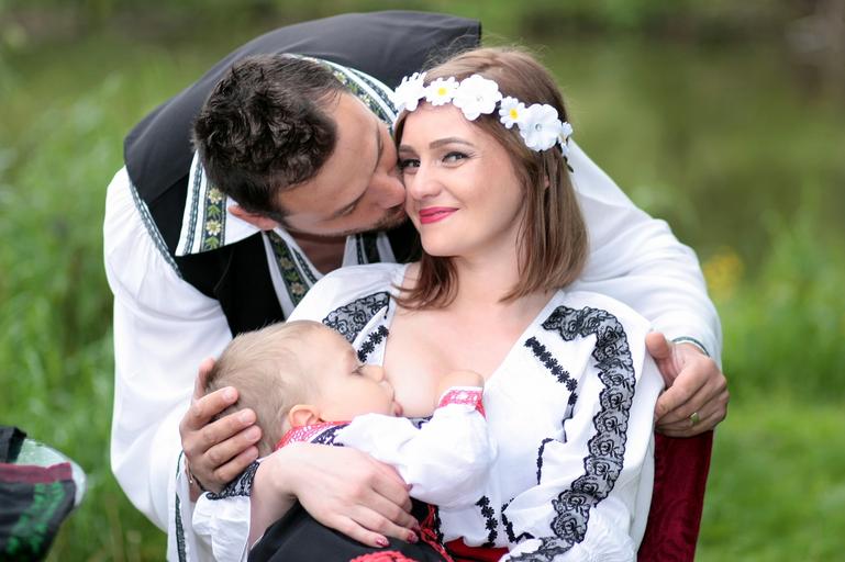 Keywords: family breastfeeding mom dad son traditional costume love happiness hug