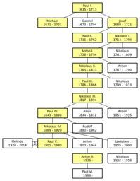 | Keywords: Family Tree House Esterhazy.svg Stammbaum der Fürsten Esterházy Family tree of the house of Esterházy the yellow background colour in some of the rectagles means that this person had the privilege to use a certain nobility title in German Fürst ; according to the source quoted by user StefanBean at de there was only one male member of the family with that special title; source Greif und Rose Geschichte eines Fürstenpaares by Hanna Molden Family_Tree_House_Esterhazy jpg 2008-09-06 15 47 UTC derivative work MaEr <span class signature-talk >talk</span> Family_Tree_House_Esterhazy jpg StefanBean at http //de wikipedia org de wikipedia original upload log This image is a derivative work of the following images Image Family_Tree_House_Esterhazy jpg licensed with PD-user-de PD-user-w 2008-03-14T08 52 59Z File Upload Bot Magnus Manske 290x650 116274 Bytes de wikipedia Stammbaum der Fürsten Esterházy Transferred from http //de wikipedia org de wikipedia Original text selbst erstellt 2007-09-01 fi Uploaded with derivativeFX House of Esterházy |