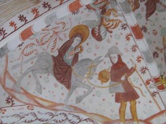 Keywords: Fanefjord Journey Egypt.JPG en Fanefjord Church Møn Denmark Fresco of the flight to Egypt own Ipigott 2009-09-09 Møn Frescos in Fanefjord Church Frescos of Flight into Egypt Swaddling in Frescos