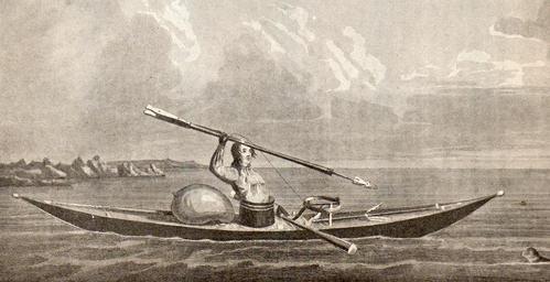 | Keywords: Fangerkajak.jpg Da Grønlandsk fangerkajak omkring 1830 Før og Nu Historisk topografisk tidsskrift og illustrationsværk 1919 redigeret af F Zachariae 1919 Stik af H G F Holm og J Holm hans far efter tegning af W A Graah på hans Undersøgelsesrejse til Grønland i Aarene 1828 - 31 PD-old H G F Holm History of Greenland Inuit kayaking |