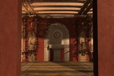 Keywords: fantasy digital render scene garden alcove bench rest sunset warm autumn dusk