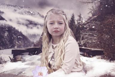 Keywords: fantasy girl children female nature portrait winter solitude sadness loneliness snow isolation bridge mountains