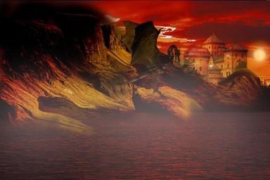 Keywords: fantasy rock castle dragon mountains sea lake water fortress