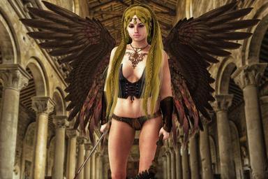 Keywords: fantasy warrior female woman winged warrior dark medieval sword young character epic