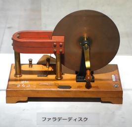 | Keywords: Faraday disk - National Museum of Nature and Science, Tokyo - DSC07366.JPG  Faraday's disk the first electric generator invented by British scientist Michael Faraday in 1931 It consists of a copper disk between the poles of a horseshoe magnet When the disk is turned with the crank a current of electrons flows radially from the center of the disk to the rim due to Faraday's law of induction This is picked up by a springy contact pressed against the rim of the disk The current flows through an external circuit and returns to the center of the disk through the axle Exhibit in the National Museum of Nature and Science Tokyo Japan Photography was permitted in the museum without restriction 2013-09-04 23 46 16 own Daderot cc-zero Scientific instruments in the National Museum of Nature and Science Tokyo Uploaded with UploadWizard Faraday disc |