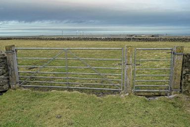Keywords: farm gate metal gate farmland field wall sky nature rural country grass countryside green