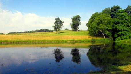 Keywords: farm pond summer sky water tree grass country meadow rural reflection green outdoor nature view land peaceful field