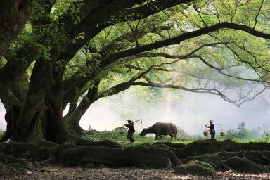 Keywords: farmer big trees cow morning worker