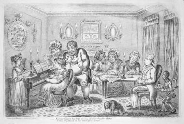 | Keywords: Farmer Giles & his wife shewing off their daughter Betty to their neighbours, on her return from school.jpg Title Farmer Giles his wife shewing off their daughter Betty to their neighbours on her return from school This 1809 caricature by Gillray satirizes a prosperous farmer's family aspiring to female musical accomplishments and other middle class refinements Text in oval on wall at left Cheese Farm Music on Piano Blue Bells of Scotland sung by Mrs Jordan On back wall Sampler sewn by Betty Giles ---- SUMMARY Cartoon showing plump girl playing piano Her parents gloat nearby while others appear less interested MEDIUM 1 print engraving CREATED/PUBLISHED London published by H Humphrey 1809 CREATOR Gillray James 1756-1815 artist http //hdl loc gov/loc pnp/cph 3f03803 Source Library of Congress Prints and Photographs Division Washington D C 20540 USA PD-old-100 James Gillray Caricatures of England Children making music 1809 cartoons music in 1809 Artworks missing infobox template |