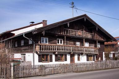 Keywords: farmhouse old 16th century farm agricultural family business residential buildings balcony wood railings upper bavaria architecture building front facade home live housewife
