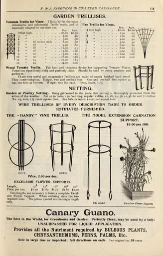 | Keywords: Farquhar's catalogue of seeds 1901 (16395996588).jpg HADE TO ORDER <br> ESTIflATES FURNISHED <br> THE ˘ ˘HANDY VINE TRELLIS <br> THE flODEL EXTENSION CARNATION <br> SUPPORT <br> 3 00 per J 00 <br> SHUT <br> OPEN <br> Price 2 00 per doz <br> EXCELSIOR FLOWER SUPPORTS <br> Length <br> Price per 100 <br> 13 15 16 18 <br> 1 50 i~6o 1 70 1 80 2 00 <br> Two lengths are necessary to form a complete Excel- <br> sior Flower Support When ordering state the two <br> required sizes The prices quoted are the single length <br> only <br> 1 1 <br> The Model <br> Excelsior Flower Support <br> Canary Guano <br> The Best in the World for Greenhouse and Garden Perfectly Clean may be used by a lady <br> UNSURPASSED FOR LIQUID APPLICATION <br> Provides all the Nutriment required by BULBOUS PLANTS <br> CHRYSANTHEMUMS FERNS PALMS Etc <br> Sold in large tins as imported; full directions on each Per original tin 50 cents 42284112 133538 66475 Text http //www biodiversitylibrary org/page/42284112 1901 10 5962/bhl title 66475 Henry G Gilbert Nursery and Seed Trade Catalog Collection ; R J Farquhar Company Biodiversity Heritage Library Farquhar's catalogue of seeds 1901 plants bulbs fertilizers tools sundries / Garden Stories Aquatic plants Bedding plants Boston Catalogs Climbing plants Equipment and supplies Flowers Fruit Gardening Massachusetts Nurseries Horticulture Nursery stock Perennials R J Farquhar Company Seeds Shrubs Trees Vegetables U S Department of Agriculture National Agricultural Library bhl page 42284112 dc identifier http //biodiversitylibrary org/page/42284112 bhlGardenStories garden Tools BHLinbloom nurseries horticulture r j farquhar company u s department of agriculture national agricultural library bhlgardenstories garden tools bhlinbloom Information field Flickr posted date ISOdate 2015-02-19 CC-BY-2 0 BioDivLibrary https //flickr com/photos/61021753 N02/16395996588 2015-08-24 02 52 02 cc-by-2 0 PD-old-70-1923 Aquatic plants Bedding plants Climbing plants Farquhar's catalogue of seeds 1901 Photos uploaded from Flickr by Fæ using a script |