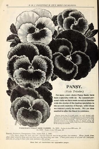 | Keywords: Farquhar's catalogue of seeds 1901 (16557219956).jpg 60 <br> R fir / FARQUHAR dr CO 'S SEED CATALOGUE <br> Viola Tricolor <br> For many years choice Pansy Seeds have <br> been a specialty with us By repeated per- <br> sonal visits we have made ourselves familiar <br> with the strains of the leading specialists in <br> the several countries of Europe with whom <br> we contract yearly for seeds We are thus <br> enabled to offer the finest in existence <br> Pansies thrive best in a cool moist but well drained soil <br> enriched with well-rotted barn-yard manure or fine ground bone <br> Seeds sown in Spring in a partially shaded situation will produce <br> fine plants for autumn flowering The finest blooms are to be <br> obtained however by sowing in July or August giving the <br> plants protection during winter when they will bloom profusely <br> in the spring and summer <br> FARQUHAR'S FINEST SHOW PANSIES No 5855 Packet of about 250 seeds 50 <br> No 5860 Packet of over 100 seeds 25 <br> Daniel Roberts Georgetown Colo writes Feb 1 1899 <br> The finest pansy bed that zuas ever seen in Colorado was in my garden last summer Many people from <br> other states admired them and said they were the fifiest they ever saw T have given away all of your old catalogues <br> and you are going to have some new customers this spring <br> See list of varieties on opposite pag-e 42284059 133538 66475 Text http //www biodiversitylibrary org/page/42284059 1901 10 5962/bhl title 66475 Henry G Gilbert Nursery and Seed Trade Catalog Collection ; R J Farquhar Company Biodiversity Heritage Library Farquhar's catalogue of seeds 1901 plants bulbs fertilizers tools sundries / Garden Stories Bedding plants Boston Catalogs Flowers Gardening Massachusetts Nurseries Horticulture Nursery stock Perennials R J Farquhar Company Seeds U S Department of Agriculture National Agricultural Library bhl page 42284059 dc identifier http //biodiversitylibrary org/page/42284059 bhlGardenStories Pansy BHLinbloom nurseries horticulture r j farquhar company u s department of agriculture national agricultural library bhlgardenstories bhlinbloom Information field Flickr posted date ISOdate 2015-02-19 CC-BY-2 0 BioDivLibrary https //flickr com/photos/61021753 N02/16557219956 2015-08-24 02 51 20 cc-by-2 0 PD-old-70-1923 Bedding plants Farquhar's catalogue of seeds 1901 Photos uploaded from Flickr by Fæ using a script |