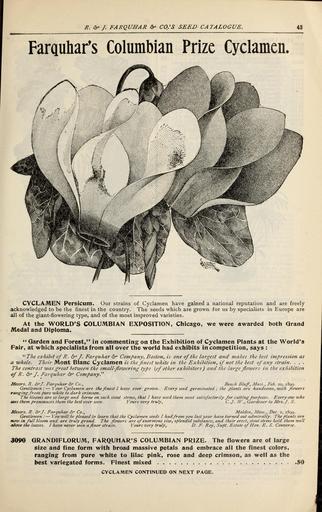 Keywords: Farquhar's catalogue of seeds 1901 (16397341089).jpg R -/ FARQUHAR COfS SEED CATALOGUE <br> 43 <br> Farquhar's Columbian Prize Cyclamen <br> CYCLAMEN Persictim Our strains of Cyclamen have gained a national reputation and are freely- <br> acknowledged to be the finest in the country The seeds which are grown for us by specialists in Europe are <br> all of the giant-flowering type and of the most improved varieties <br> At the WORLD'S COLUMBIAN EXPOSITION Chicago we were awarded both Grand <br> Medal and Diploma <br> Garden and Forest in commenting on the Exhibition of Cyclamen Plants at the World's <br> Fair at which specialists from all over the world had exhibits in competition says <br> The exhibit of R J Farquhar 6° Company Boston is one of the largest and makes the best impression as <br> a whole Their Mont Blanc Cyclamen is the finest white in the Exhibition if not the best of any strain <br> The contrast was great between the small-flowering type of other exhibitors and the large flowers in the exhibition <br> of R 5r»y Farquhar 6° Company <br> Messrs R J Farquhar S Co <br> Gentlemen ” Your Cyclamen are the finest I have ever grown <br> ranging from pure white to dark crimson <br> The blooms are so large and borne on such stout steins that I have used tJie n most satisfactorily for cutting purposes Every one who <br> sees them pronounces them the best ever seen Yours very truly C f IV Gardener to Mrs f S <br> Beach Bluff Mass Feb 20 1899 <br> Every seed germinated ; the plants are handsome with flowers <br> Messrs R f Farquhar 5r Co Maiden Mass Dec 2 1899 <br> Gentlemen ” You will be pleased to learn that the Cyclamen seeds I had from you last year have turned out admirably The plants are <br> now in full bloom and are truly grand The flowers are of enormous size splendid substance and their erect stout stems fwld them well <br> above the leaves I have never seen a finer strain Yours very truly D F Roy Supt Estate of Hon E S Converse <br> 3090 <br> GRANDIFLORUM FARQUHAR'S COLUMBIAN PRIZE The flowers are of large <br> size and fine form with broad massive petals and embrace all the finest colors <br> ranging from pure white to lilac pink rose and deep crimson as well as the <br> best variegated forms Finest mixed 50 <br> CYCLAMEN CONTINUED ON NEXT PAGE 42284042 133538 66475 Text http //www biodiversitylibrary org/page/42284042 1901 10 5962/bhl title 66475 Henry G Gilbert Nursery and Seed Trade Catalog Collection ; R J Farquhar Company Biodiversity Heritage Library Farquhar's catalogue of seeds 1901 plants bulbs fertilizers tools sundries / Garden Stories Bedding plants Boston Catalogs Climbing plants Flowers Gardening Massachusetts Nurseries Horticulture Nursery stock Perennials R J Farquhar Company Seeds U S Department of Agriculture National Agricultural Library bhl page 42284042 dc identifier http //biodiversitylibrary org/page/42284042 bhlGardenStories Cyclamen BHLinbloom nurseries horticulture r j farquhar company u s department of agriculture national agricultural library bhlgardenstories bhlinbloom Information field Flickr posted date ISOdate 2015-02-19 CC-BY-2 0 BioDivLibrary https //flickr com/photos/61021753 N02/16397341089 2015-08-24 02 52 33 cc-by-2 0 PD-old-70-1923 Bedding plants Climbing plants Farquhar's catalogue of seeds 1901 Photos uploaded from Flickr by Fæ using a script |