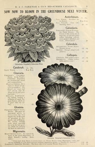 Keywords: Farquhar's mid-summer catalogue (16992301815).jpg R J FARQUHAR CO 'S MID-SUMMER CATALOGUE <br> SOW NOW TO BLOOM IN THE GREENHOUSE NEXT WINTER <br> Antirrhinum p <br> Tall White Excellent for <br> cut flowers 50 io <br> Tall Yellow Clear l uff <br> 50 10 <br> charming shade <br> Calceolaria <br> Farquhar's Large-Flower- <br> ing Prize Strain The <br> flowers of this strain are of <br> large size of rich and varied <br> colors including self-col- <br> ored spotted blotched and <br> laced Finest mixed <br> Calendula <br> Calceolaria Farquhar's Columbian Prize <br> Candytuft <br> Giant White <br> Cineraria <br> Farquhar's Columbian <br> Prize At the World's <br> Columbian Exposition <br> we received this award <br> and commendation <br> Aleaal and Diploma For a <br> Superior Strain of Cin- <br> erari grandijlora The <br> flowers are large and <br> well colored and the <br> plants are of good form <br> and habit <br> Stellata a tall branch- <br> ing variety bearing a <br> profusion of small fra- <br> grant flowers which are <br> of great value for cut- <br> ting <br> Gloxinia <br> Farquhar's Erect Giant <br> Mixed The great ad- <br> vancement made in <br> Gloxinias has been <br> largely due to the work <br> of specialists in Nor- <br> mandy and in Belgium <br> We receive annually <br> seeds saved especially <br> for us by the best grow- <br> ers which are certainly <br> the finest in cultivation <br> Oz Pkt <br> 40 05 <br> ¢50 <br> ¢75 <br> ¢50 <br> Migi <br> ¢50 <br> Grandiflora Flore Pleno <br> Deepest orange <br> ¢2 S <br> ¢05 <br> Meteor Orange striped with <br> primrose <br> 20 <br> ¢05 <br> Calliopsis <br> CorONATA Pure golden yellow <br> 40 <br> ¢OS <br> Drummondi Golden yellow <br> with maroon centre <br> ¢30 <br> ¢05 <br> ;nonette <br> Evans' Boston Giant We control the <br> stock of this grand Mignonette of <br> which Boston's leading florist ž i -t - <br> ' ' Cineraria Farquhar's Columbian Prize <br> writes <br> I have used from fifteen to twenty dozen of ' Evans' Boston Giant Mignonette ' daily and <br> can say truthfully it is the finest and most fragrant Mignonette grown ” Thomas F Galvin 1 50 20 <br> Farquhar's Improved Machet The finest type of the popular Machet Mignonette i oo 15 43902029 149998 78553 Page 5 Text http //www biodiversitylibrary org/page/43902029 1902 10 5962/bhl title 78553 Henry G Gilbert Nursery and Seed Trade Catalog Collection ; R J Farquhar Company Biodiversity Heritage Library Farquhar's mid-summer catalogue 1902 Bedding plants Boston Catalogs Equipment and supplies Flowers Gardening Massachusetts Nurseries Horticulture Nursery stock Perennials R J Farquhar Company Seeds U S Department of Agriculture National Agricultural Library bhl page 43902029 dc identifier http //biodiversitylibrary org/page/43902029 bhlGardenStories Calceolaria Cineraria nurseries horticulture r j farquhar company u s department of agriculture national agricultural library bhlgardenstories Information field Flickr posted date ISOdate 2015-03-31 CC-BY-2 0 BioDivLibrary https //flickr com/photos/61021753 N02/16992301815 2015-08-23 22 08 48 cc-by-2 0 PD-old-70-1923 Farquhar's mid-summer catalogue Photos uploaded from Flickr by Fæ using a script |