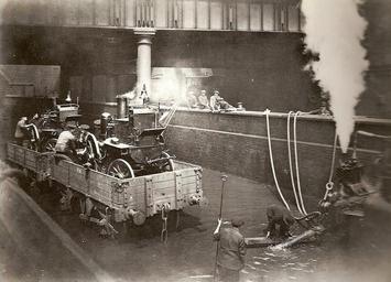 | Keywords: Farringdon Flood 1915.jpg Emergency work at Farringdon Underground station following Two horse drawn fire engines carried on 3 plank railway wagons are pumping water out a further pump attached to a steam engine is on the bottom right In the background a Metropolitan Railway guards van can be seen 1915-05-06 Author PD-old Railway wagons of Britain Railway brake vans of Britain 6 May 1915 photographs Steam-powered fire engines Historical fire engines of the United Kingdom Fire engines in London 1915 in London 1915 in rail transport in the United Kingdom Trains at Farringdon station Firefighting and rail transport |