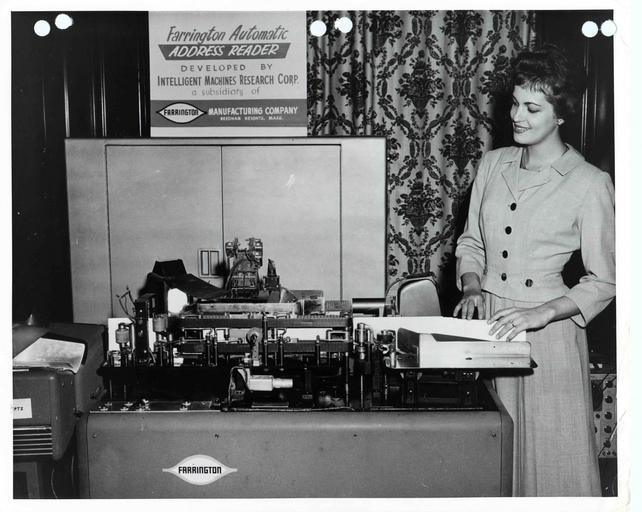 | Keywords: smithsonian institution smithsonianinstitution farrington automatic farringtonautomatic address reading machine addressreadingmachine usps intelligent machines research corporation intelligentmachinesresearchcorporation 1953 imr farrington summerfield address machine addressmachine post national postal museum nationalpostalmuseum mail across the commons mailacrossthecommons blackandwhite black and white Description: A postal employee shows off the Department's new automatic address reading machine. The "Farrington Automatic" machine was developed by Intelligent Machines Research Corporation. Postmaster General Arthur Summerfield tested and purchased a variety of machines to help speed up mail processing in large city post offices in the early 1950s. Creator/Photographer: Unidentified photographer Medium: Black and white photographic print Culture: American Geography: USA Date: 1953 Collection: Machinery Collection Repository: National Postal Museum Accession number: A.2008-36 Persistent URL: arago.si.edu/index.asp?con=2&cmd=1&id=194388 View more collections from the Smithsonian Institution. Description: A postal employee shows off the Department's new automatic address reading machine. The "Farrington Automatic" machine was developed by Intelligent Machines Research Corporation. Postmaster General Arthur Summerfield tested and purchased a variety of machines to help speed up mail processing in large city post offices in the early 1950s. Creator/Photographer: Unidentified photographer Medium: Black and white photographic print Culture: American Geography: USA Date: 1953 Collection: Machinery Collection Repository: National Postal Museum Accession number: A.2008-36 Persistent URL: arago.si.edu/index.asp?con=2&cmd=1&id=194388 View more collections from the Smithsonian Institution. |
