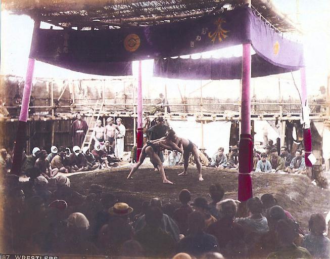 | Keywords: Farsari sumo.jpg Wrestlers A sumo match showing rikishi wrestlers a gyōji referee and an audience Japan c 1886 hand-coloured albumen print on a decorated album page by Adolfo Farsari Accessed 14 February 2006 http //www wul waseda ac jp/TENJI/virtual/farsari/index html Waseda University Library; Exhibitions; WEB; Farsari No 37 2006-02 Creator Adolfo Farsari PD-old-100 Black and white photographs of sumo Photographic Views of Japan with Historical and Descriptive Notes Images from the Waseda University Library Hand-colored photographs of Japan Adolfo Farsari 1886 in Japan |
